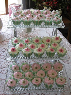 What is better than a tray of pink cupcakes? Three trays of pink cupcakes! When we first spoke about an afternoon bridal tea, we considered petit fours,traditional cupcakes, and sliced party cake. But minis seemed like the perfect way to play with the green and pink floral theme and give everyone the right amount of sweet.